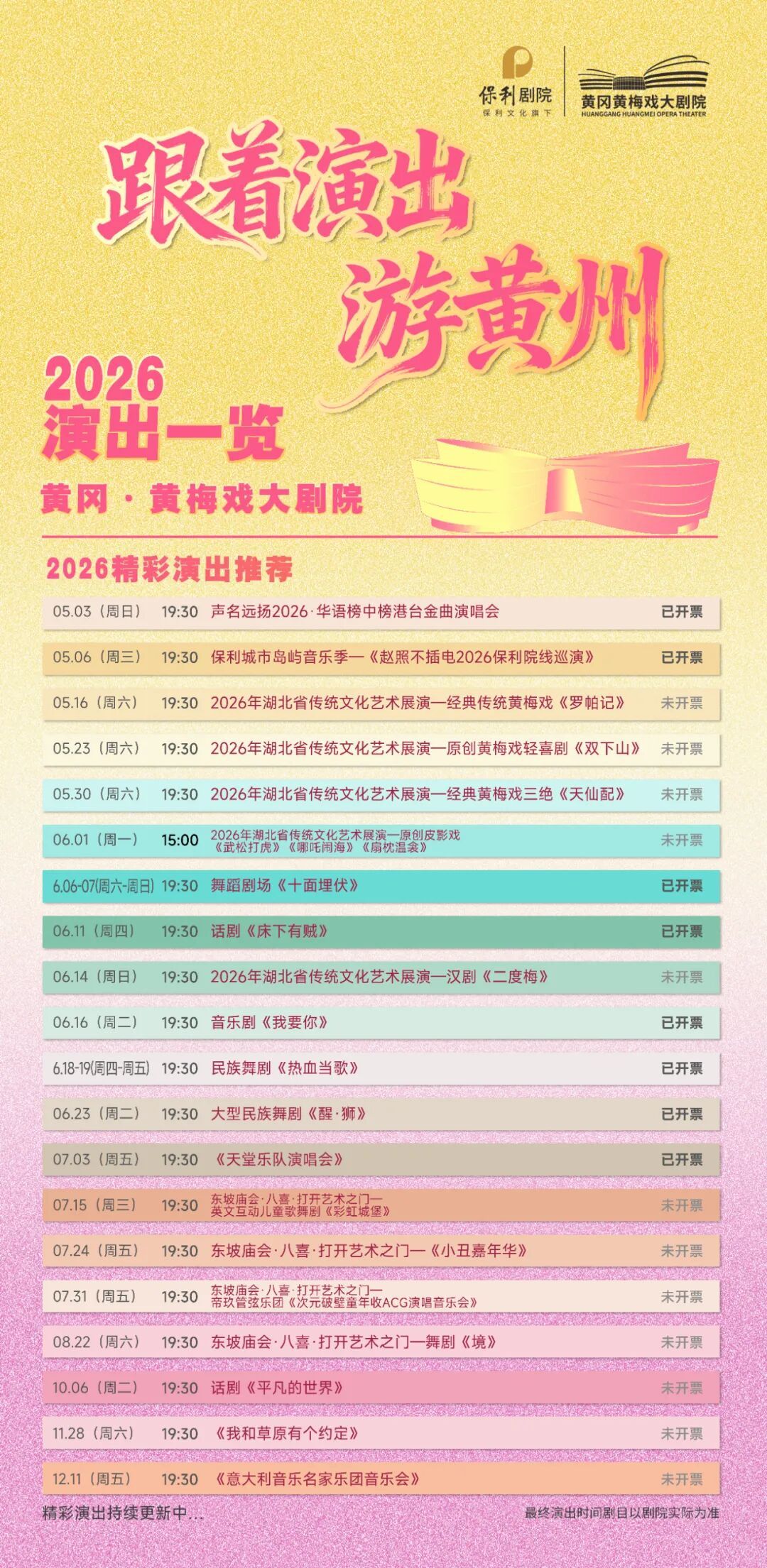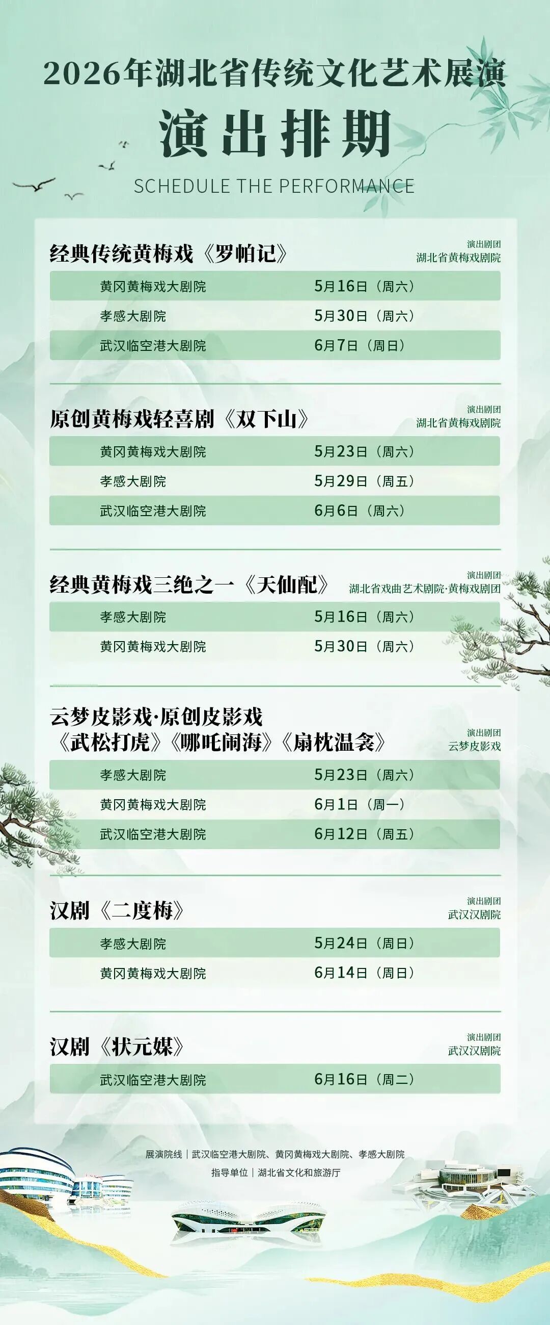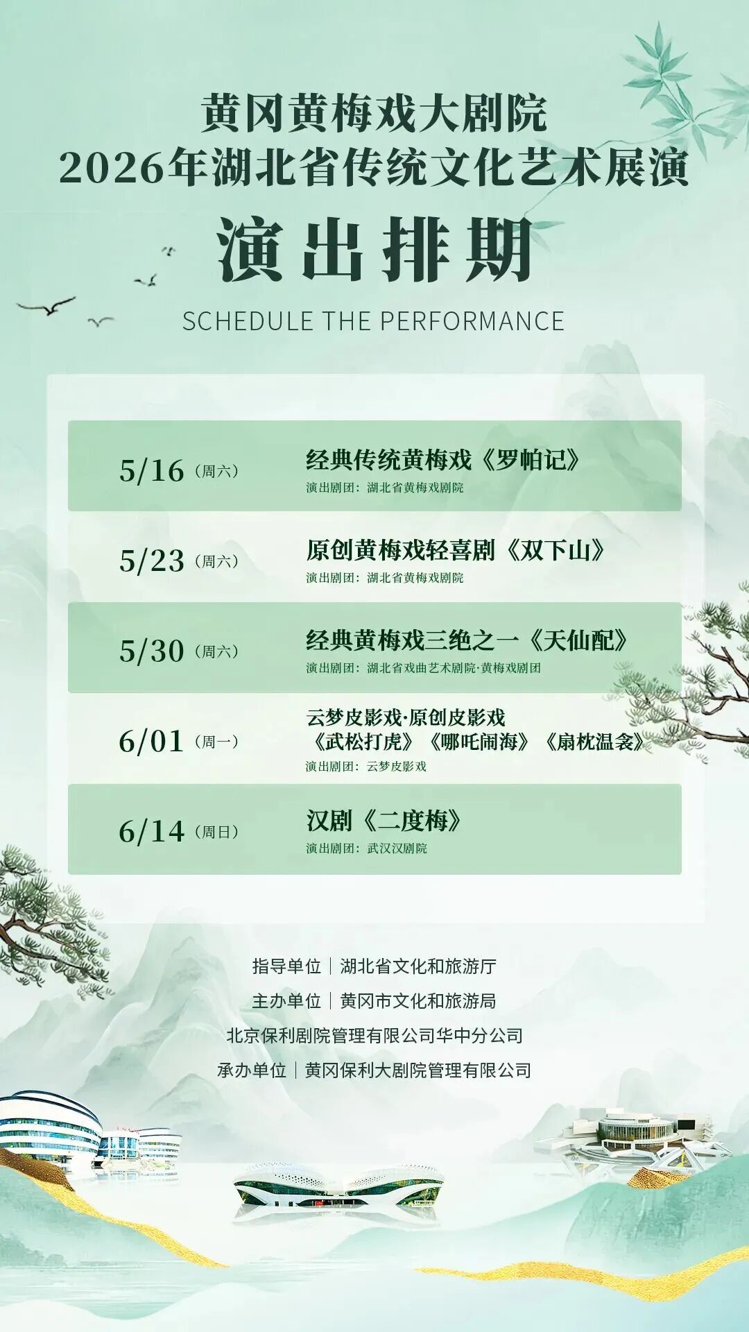 为深入贯彻落实《湖北省黄梅戏振兴发展行动方案(2026—2030年)》,推动荆楚传统文化创造性转化与创新性发展,由湖北省文化和旅游厅指导,武汉市东西湖区文化和旅游局、黄冈市文化和旅游局、孝感市文化和旅游局及北京保利剧院管理有限公司华中分公司联合主办的2026年湖北省传统文化艺术展演,即将在武汉临空港大剧院、黄冈黄梅戏大剧院、孝感大剧院三城同步启动。