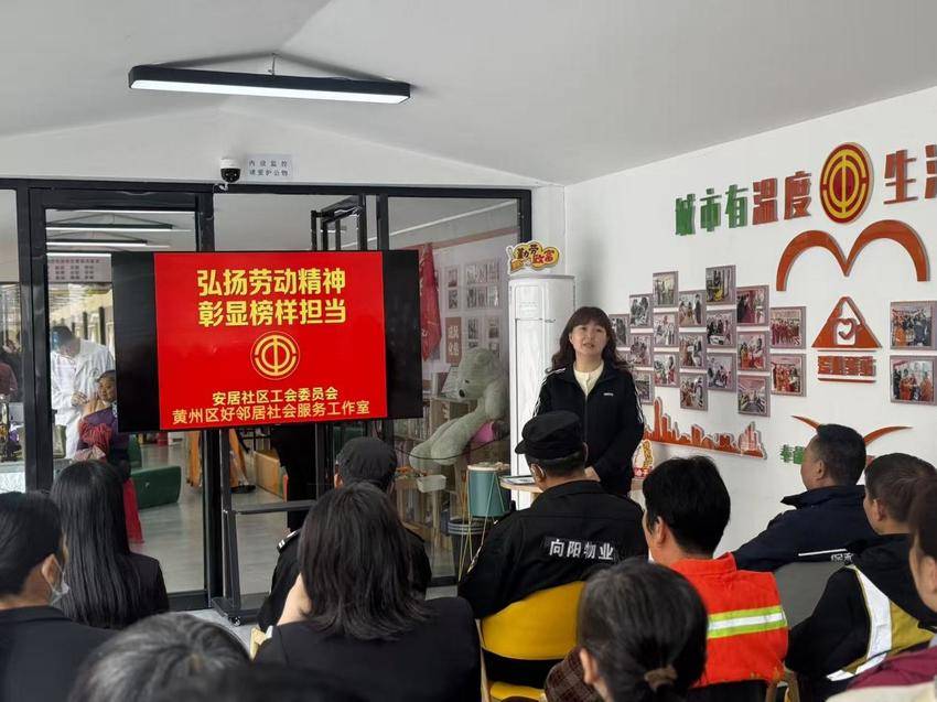 在模范宣讲环节,社区以辖区物业劳动典型徐元安同志为榜样,开展专题宣讲活动。徐元安同志在物业一线工作多年,他始终坚守岗位、认真服务居民、无私奉献,从日常小区保洁维护、应急事务处置,到主动关心居民需求、耐心解决实际问题,全方位展现了一线劳动者的责任与担当。现场户外工作者认真聆听,不时报以热烈掌声,纷纷表示将以徐元安同志为榜样,立足本职岗位,以更饱满的热情投入到工作中。