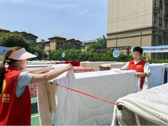 活动现场秩序井然,暖意满满。物业工作人员挨家挨户收业主家中厚重棉被、毛毯、床品被褥,逐一为每床被褥张贴专属防混拿标签,细心铺展抚平被褥边角,定时专业翻面拍打,充分借助自然阳光高效杀菌除潮、去除异味,让每床被褥都均匀晒透暖阳,牢牢锁住清爽干净的自然太阳香。