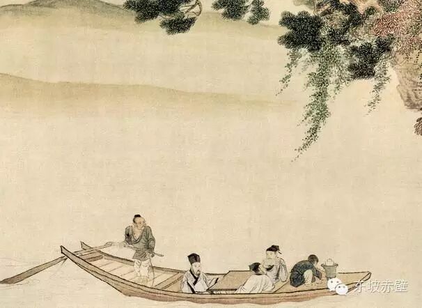 由于仇英出身低下,文化又浅,他的交往受到限制,特别是画家朋友不多。他只能通过先生文徵明、沈周、文嘉、项元汴等少数画家借阅古画范本,精心临摹。天长日久,他的临摹功力非同凡响,常常可以乱真并时出新意。所以,在创作《赤壁图》时,仇英为了适当地表达词人宽阔的胸襟和远大的抱负,一反自己的常见作品中那种工整谨严,华丽繁密的画风,以淡淡的笔触,清丽雅致的色调,描摹出空濛、远大、自然的景致。画面中,缓行一叶扁舟处于中景位置,只见东坡先生与好友在舟中饮茶聊天。静谧辽阔,一派平和的气氛。在景物的布置上,仇英配置远山近壁,山壁悬崖呈斜向延伸,山崖上杂木丛生,古柏苍劲,托出了赤壁的险峻形势。而奇峭的悬崖与大片平静的江面又造成了典型的虚实对比,恰到好处地表现了赋文中“白露横江,水光接天,纵一苇之所知,凌万顷之茫然”的意境与氛围。