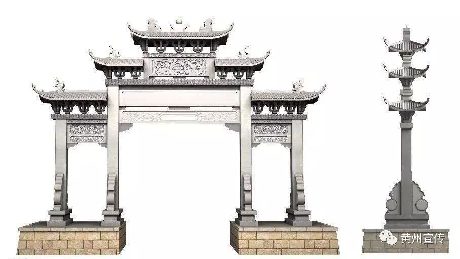 黄州城的牌坊规格都不很大,乃以精巧著称。规模小有两方面的原因:一为黄州街道较窄,难容跨度较大的牌坊;二为红砂石材不太坚硬,跨度过大容易断裂。黄州牌坊都是四表柱,三坊门,中门宽,偏门窄。一般两层,三层的不多。说它精巧,主要是指制造工艺。每座牌坊榫卯相扣,严丝合缝,精雕细刻,玲珑别致。牌坊都有名称,榜于中门之上。旌表对象都要将姓名、官职刻之于石,嵌于表柱之间,有的在坊榜之下,有的在坊榜两侧,正面和反面的结构装饰基本一样,是横跨街道或巷口的独立建筑物。